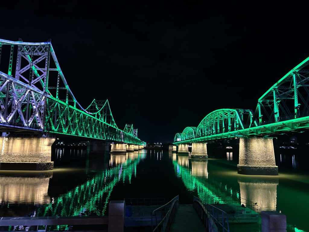 右の鴨緑江断橋は日本統治時代の1911年に作られ、船舶が通行できるように回転する機構がついていたそうだ。