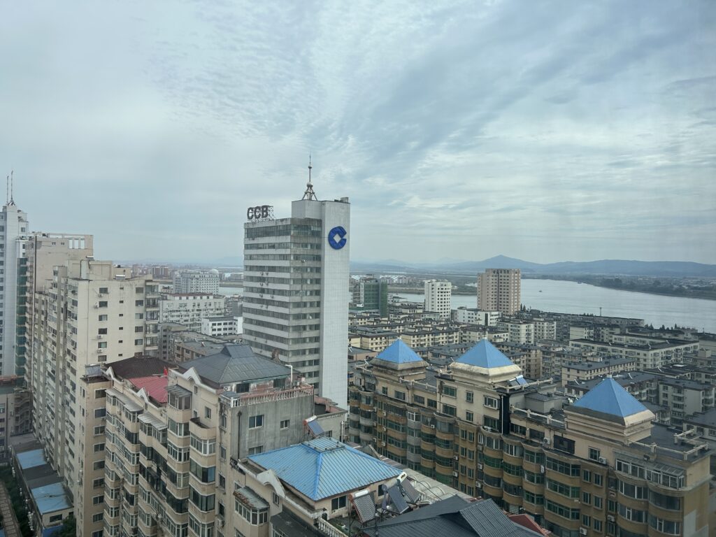 朝起きて窓の外を見ると昨日見た国境の河、鴨緑江が見えた。