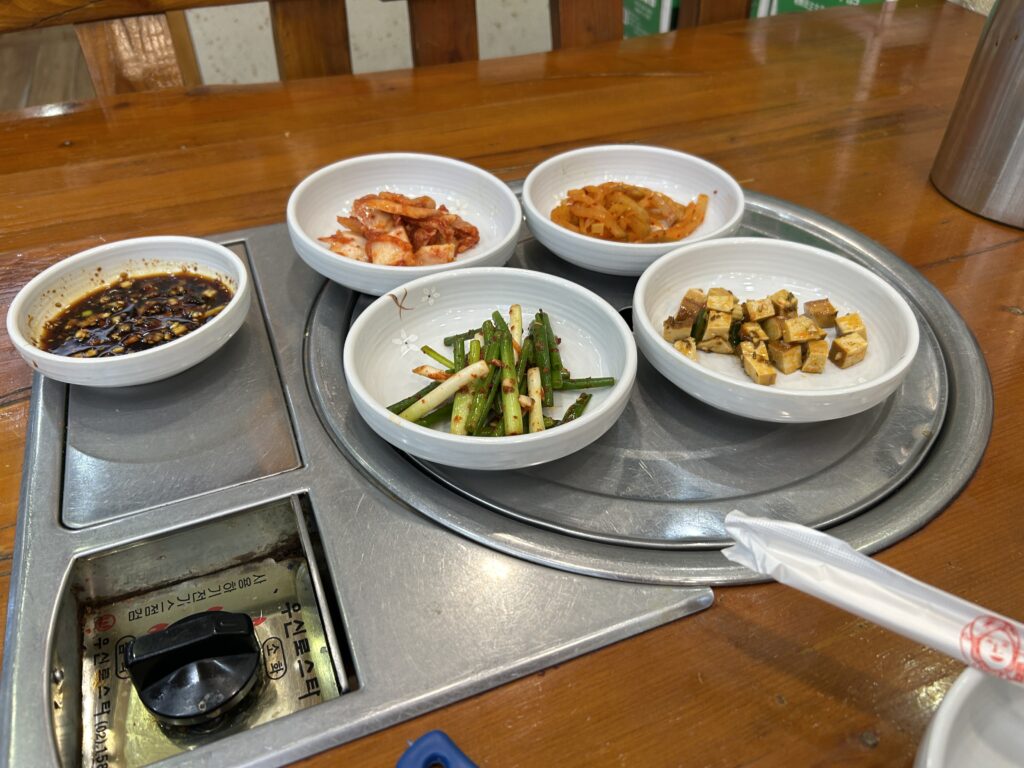 朝鮮料理の店らしく、最初にお通しのような形でキムチなどが数種類運ばれてきた。どれも酒が進む味だが、中でも右下にあった豆腐のような料理が非常に旨かった。