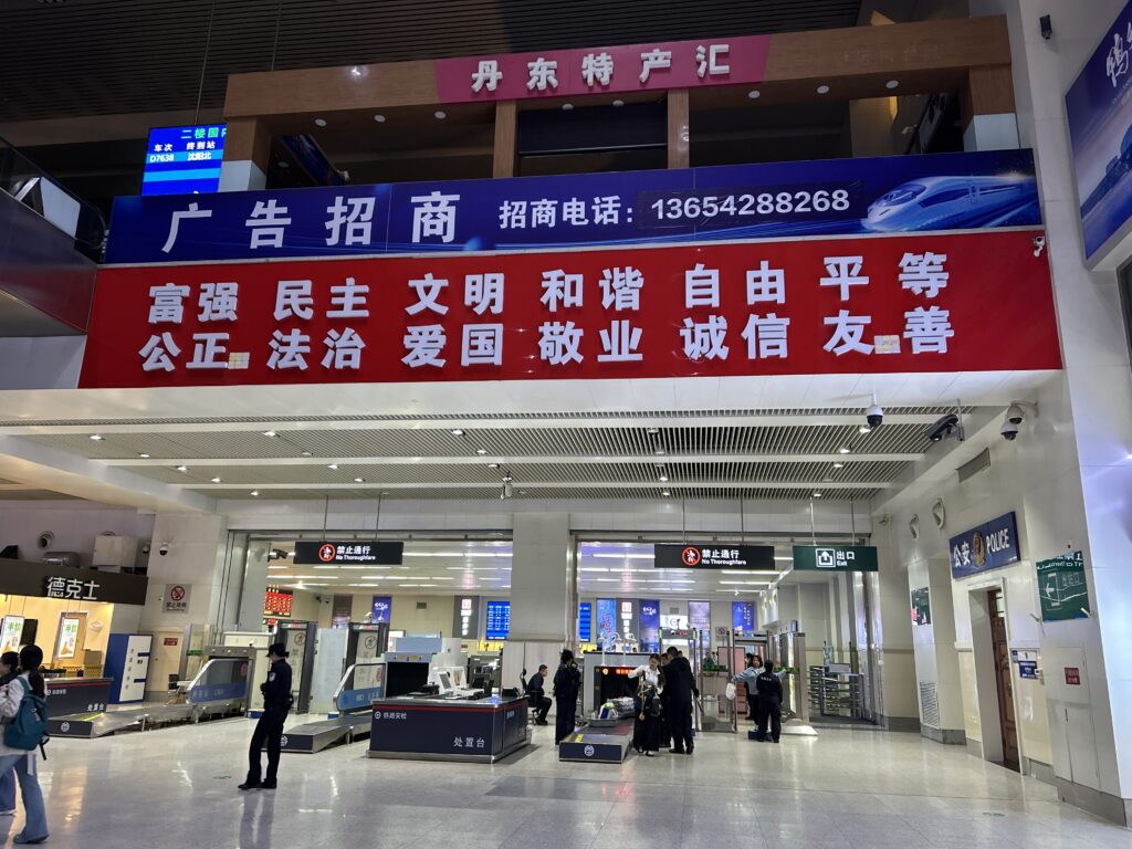 駅に入ると、お決まりの「社会主義核心価値観」のスローガンがお出迎え。
