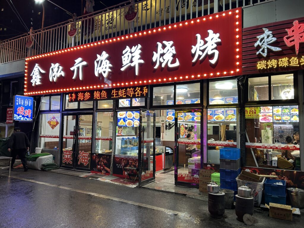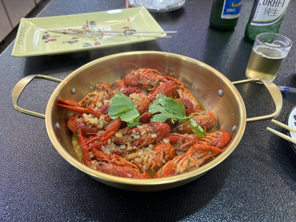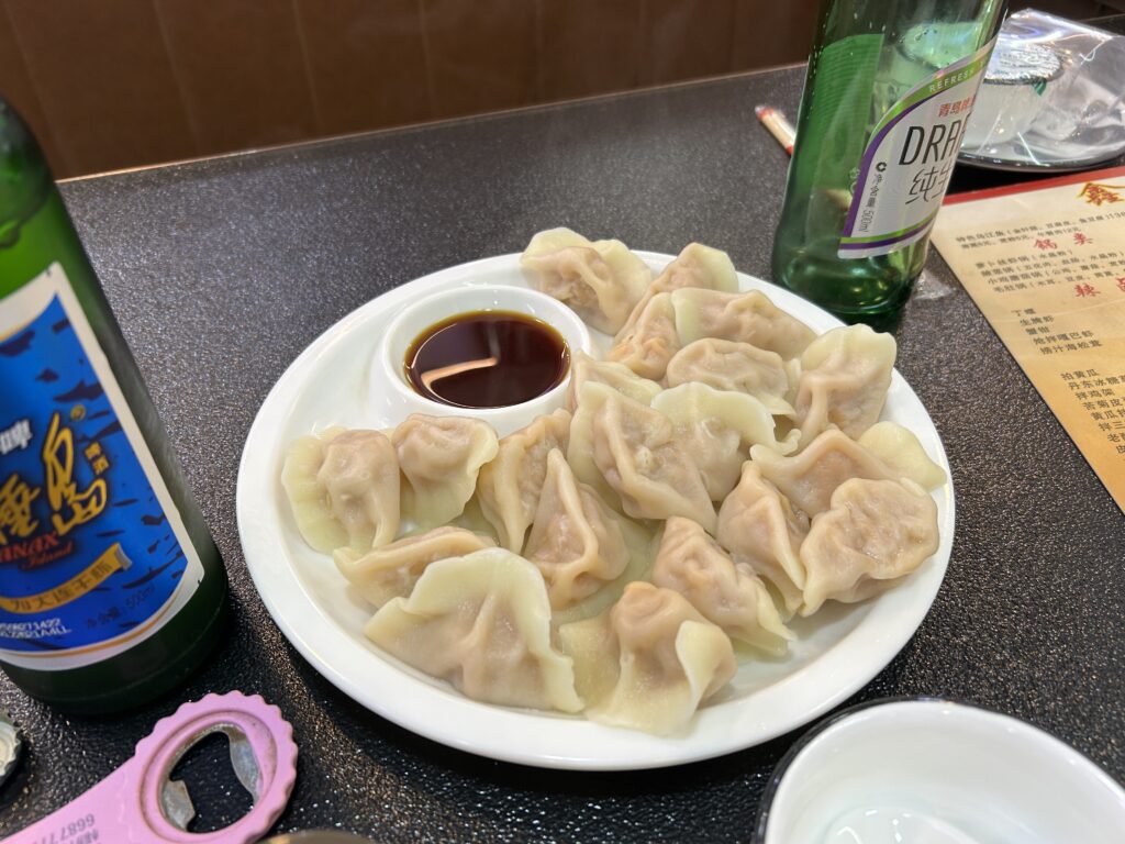 夕食は近くの海鮮料理屋へ。大連はウニ餃子が有名らしいので、それとザリガニを注文した。
