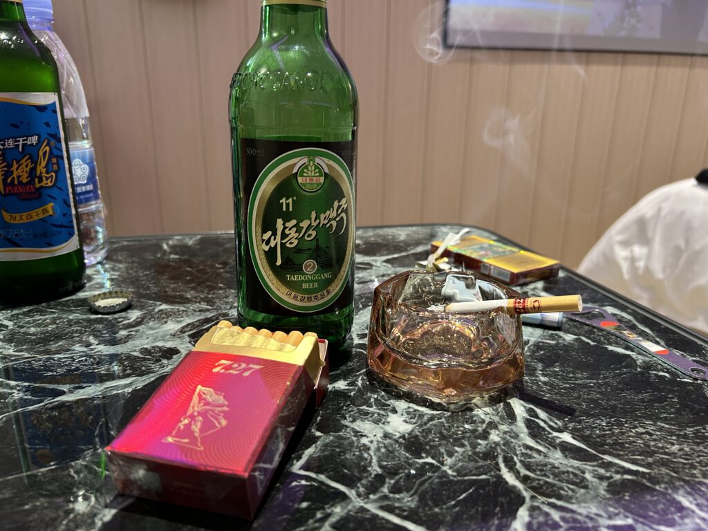 部屋で、丹東で仕入れたタバコとビールで一服。気分はすっかり北朝鮮人だ。
