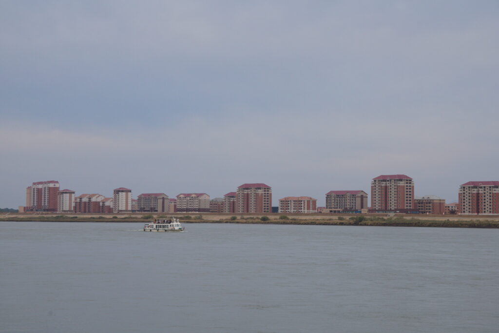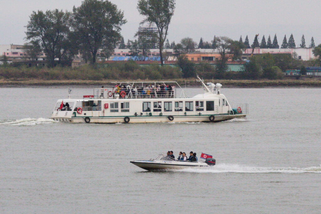 ふと甲高い音が聞こえて川に目をやると、北朝鮮の国旗を掲げたモーターボートが姿を現した。 乗っているのは、あちら側の観光客だろうか。国境沿いの観光を楽しめるとなれば、おそらくは相当な「上級国民」なのだろう。