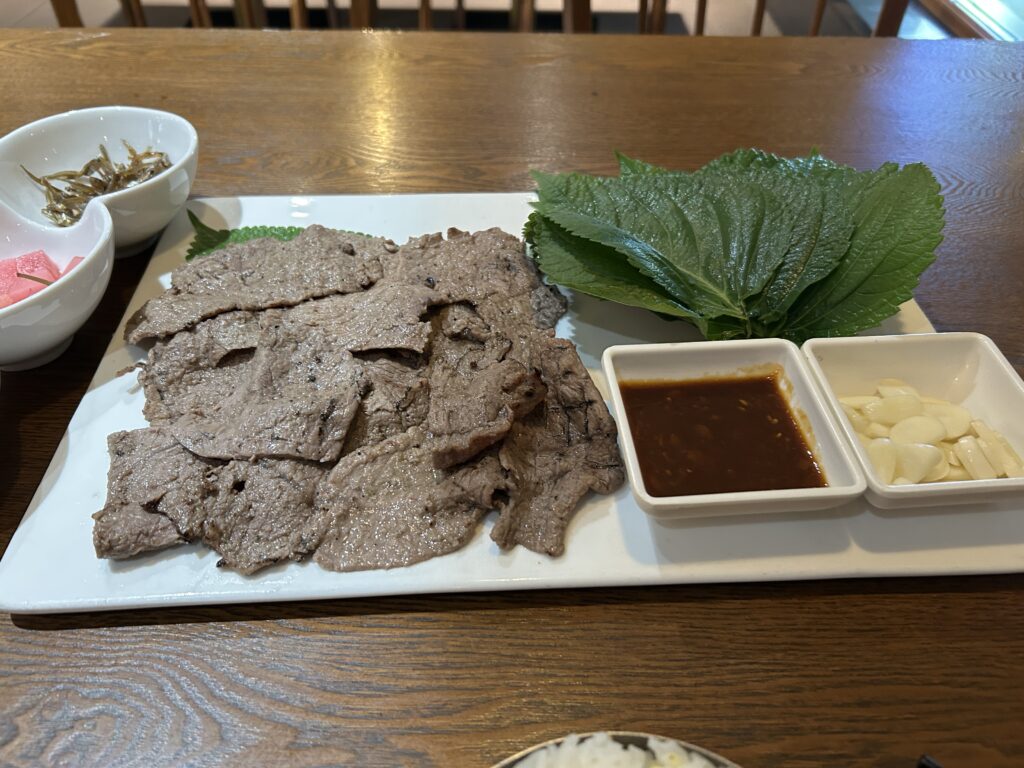 炭火の香りが漂う肉とにんにくを荏胡麻の葉で巻いて食べるとこれがまた格別。