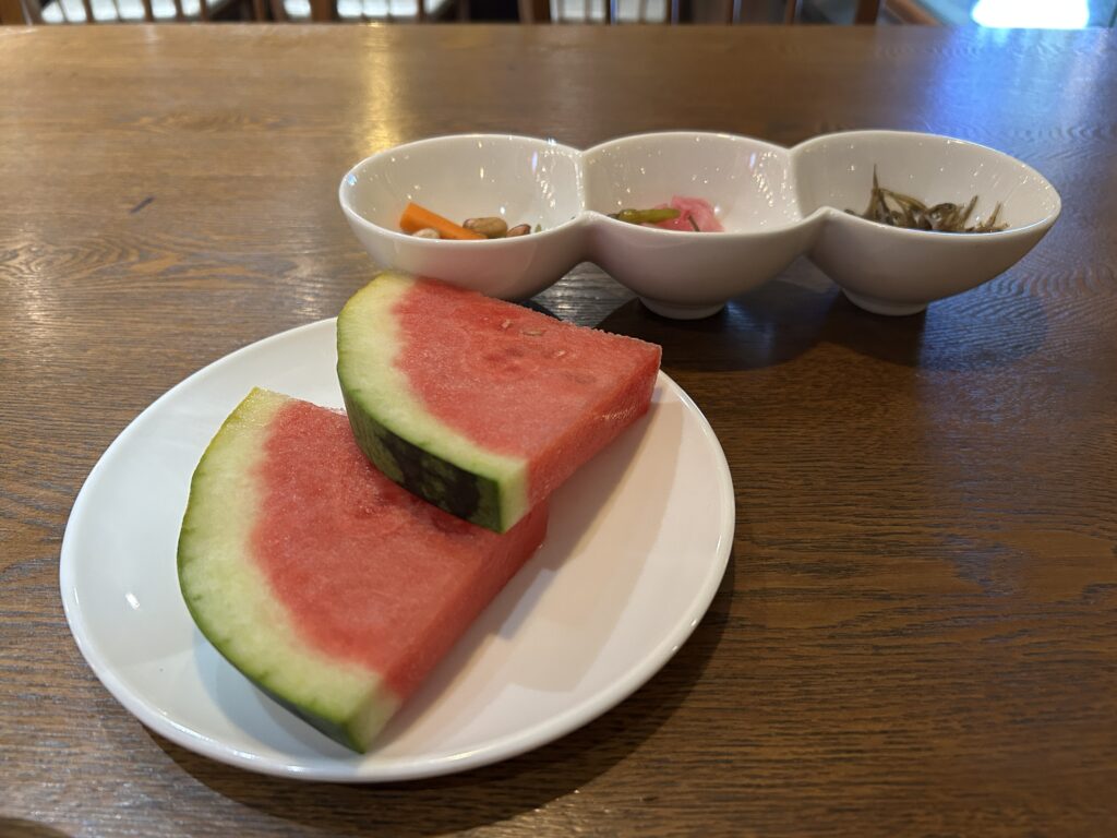 1号ビールと同時に来たサービスのすいかを食べて食事終了。